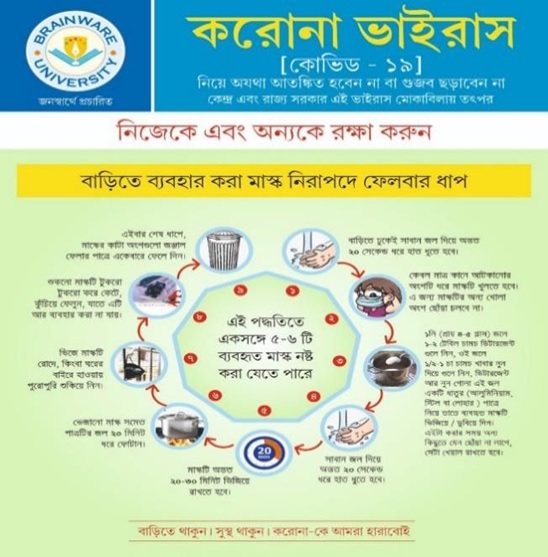 Keeping in view of the spread of Novel Corona Virus (COVID- 19) the students of Brainware University also took measures to spread the safety precaution information among villagers and explain why social distance maintenance is necessary in this tough time in local languages by the use of digital media like, WhatsApp group and printed material.