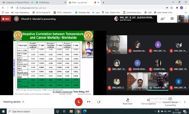 The Department of Biotechnology, Brainware University, celebrated National Pollution Control Day 2020 on December 2, 2020 at 5PM by organizing an informative workshop on Environmental Temperature linked to pollution, cancer and COVID-19.