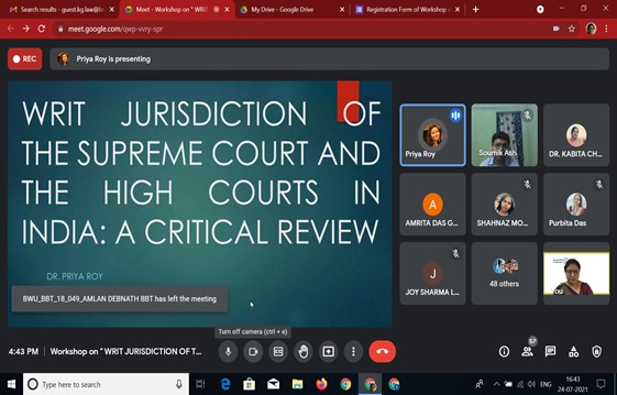 To make the students aware of the workings of the judiciary, the Department of Law, Brainware University organized a workshop on “Writ Jurisdiction of the Supreme Court and the High Courts in India- A Critical Review” on July 24, 2021 at 4:30 PM. Dr. Priya Roy (Assistant Professor & Co-ordinator, Department of Law, Raiganj University) was the guest speaker for this event.