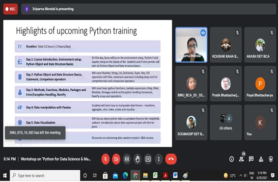 Learning Data Science has always been an uphill task. To bridge this gap,the Department of Computational Science organized a workshop on “ Python for Data Science and Machine Learning” from June 29, 2021 to July 9, 2021. The speaker for this event was Ms. Sriparna Mondal (Data Scientist, Villanova University, USA)