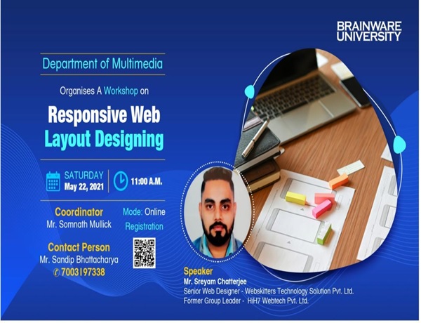 What can be better than a career workshop training provided by an industry expert? An online workshop on Responsive Web Layout Designing was organised by the department of Multimedia, Brainware University on May 22, 2021. The objective of the event was to demonstrate to the audience the designing process of an effective Responsive Web Layout Designing from the receiving of the specifications from the client to conceptualising, designing and delivering the layout. To grace the occasion, the guest speaker Mr. Sreyam Chatterjee, Senior Web Designer of Webskitters Technology Solution Pvt Ltd. was invited. Mr Chatterjee instructed students on how a good website design can be created to fit clients’ standards and the basic strategies of creating a unique design. The session was attended by all the students of the Multimedia department.