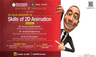 The universe of Multimedia and Animation is an exciting and colourful one. It is a field that gives wings to creative energy and a platform to focus on one’s passions. The Department of Multimedia, in collaboration with one of the foremost houses in the Animation industry, Spirited Bio Animation Studio, organized an online workshop on “Skills of 2D Animation” on 10th October, 2020, to help the students of the department get a hands-on experience in professional animation skills.Mr. Soumavo Ghosh Dastidar, Mr. Saubhik Bhattacharya and Mr. Sumit Shrivastava of Spirited Bio Animation Studio engaged the students and trained them in the concepts of artistry in dimensional spaces, the illusion of movement and space, speed of frames and many such skills helping them acquire a realistic knowledge of how to adapt a story to the screen. This event was also a part of Brainware University’s Campus to Corporate Programme where along with skill and knowledge, students get a real-life feel of professional industrial requirements and ways of working.