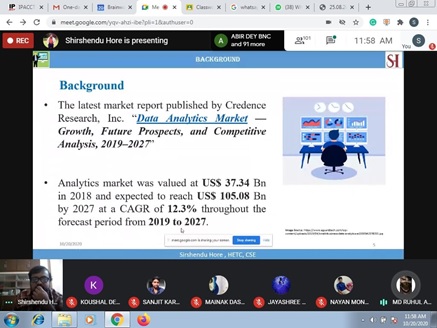 The era of big data analytics has made us believe that statistical data is the key to unlocking human behaviour. Can human actions truly be quantified by numbers? What is the future of data analytics and R programming? To find the answer to these questions and introduce our students to data analytics which has seen a 62 percent increase in the job market in 2020 alone, the Department of Cyber Science & Technology arranged a webinar —‘Introduction to Data-Analytics and R-Programming’ on October 21, 2020. Our guest speaker, Mr Sirshendu Hore (Assistant Professor, Department of Computer Science& Engineering, HETC) demonstrated how data analytics is aiming to predict every human action with a remarkable degree of accuracy. Software analyzes huge amounts of data to come up with the most probable conclusions. Are they always correct and is it ethically right? That was the driving force behind the discussions.