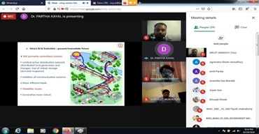 Electricity disruptions can sometimes have a cumulative effect. A series of failures can affect banking, communications, traffic and security. Ivan Penn, reporting for The New York Times on September 3, 2020 stated that infrastructural damage in California electricity grids cost millions of dollars between 2000 and 2001.To enable students to minimize the effects of natural disasters like storms, earthquakes and large solar flares and to gain knowledge on Smart Grid Technology, the Department of Electrical Engineering, Brainware University, invited Partha Kayal (Department of Electrical Engineering, NIT, Silchar) on October 19, 2020. Mr. Kayal initiated the discussion by highlighting the advantages of Smart Grid Technology and the reason behind calling it smart.