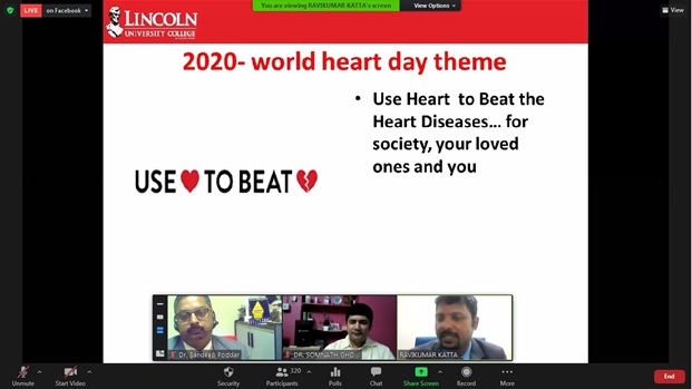World Heart Day is a global campaign during which individuals, families, communities, and governments around the world participate in activities to take charge of their heart and that of others. And in recognition of this day, an International Collaborative Webinaron ‘Stay Fit Love Heart’ was organised on 5 October,2020 from 2 PM by the Department of Allied Health Sciences, in collaboration with Lincoln University College, Malaysia.