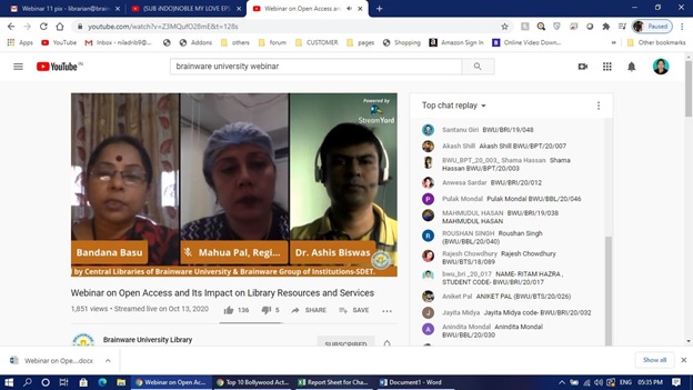 The emergence and growth of Open Access publishing have ushered in significant changes to the world of scholarly communication since the migration to digital publishing began over a decade ago. The Internet and Information and Communication Technologies make it easy to publish and share content online.To enlighten us about ‘Open Access and Its Impact on Library Resources and Services’, a webinar was jointly organized by Institute innovation Council, Central Libraries of Brainware University and Brainware Group of Institutions-SDET through YouTube live stream on 13.10.2020. The key speaker was Dr. Ashis Biswas (Librarian, Victoria Institution College, Kolkata) who started with a short introduction about Open and Closed Access and the paradigm shift in its resources.Dr. Biswas proceeded to explain the use of ‘Directory of Open Access Journals (DOAJ)’ site which provides open access articles easily. There are two types of open access resources depending on their copyrights, Gold and Green. He then explained the importance of Sherpa Romeo which is an online resource for viewing copyright and archiving policies for journals globally. He also talked about the significance of peer reviewed journals and how one can avoid predatory journals.