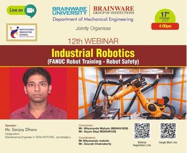 To inform students about the latest developments in the field of robotics, the Department of Mechanical Engineering, Brainware University, along with Brainware Group of Institutions, organized a webinar titled ‘Fanuc Robot Training-Robot Safety’ on October 17, 2020 at 4pm.Mr. Dhara initiated the discussion by highlighting Robot Safety. He informed students that the major features that a robot should have are intelligence, vision and force sensing. The speaker delivered a vivid description by showing block diagrams on how the control unit and the mechanical unit (robot) collaborate together.