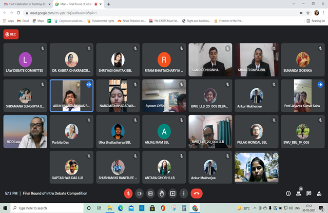 Brainware University organized an online Intra- University Debate Competition on October 29-30, 2021. The event saw a robust participation from students in the university with 16 teams participating in heated debate about issues having social and political import. Distinguished judges from Gour Banga University, Hooghly Mohsin College, Surendranath Law College, Raiganj University, Bankura University and the University of Calcutta graced the occasion. After a fierce battle which lasted three intense rounds, two teams made it to the final stages with Suniti Sinha and Samriddhi Sinha emerging winners and Arun Kumar Biswas and Nabamita Bharadwaj occupying the runners-up position. The students displayed great dexterity with their words and the judges were impressed with the manner in which the participants navigated complex social issues creatively, all the while maintaining a competitive, fighting spirit.