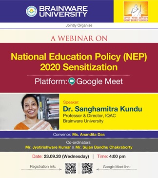 The new National Education Policy (NEP) was approved by the Union Cabinet on July 29. To spread awareness about the changes proposed by the National Education Policy(NEP) 2020 Brainware University in collaboration with Unnat Bharat Abhiyan organised a webinar on “National Education Policy(NEP)2020 Sensitization On 23 September 2020 at 4 pm to help us learn about how the New Education Policy can change the education system for the better. Our speaker Dr .Sanghamitra Kundu(Professor & Director, IQAC, Brainware University) provided us a comprehensive view of the National Education Policy 2020, which envisions a contemporary education system that foresees to contribute directly to transform our nation sustainably into an equitable and vibrant knowledge society, by providing high quality education to all. She described in details how this Policy envisages creation, transmission, use and dissemination of knowledge as a part of the continuum. Faculty members and students from all departments joined in for this informative webinar.