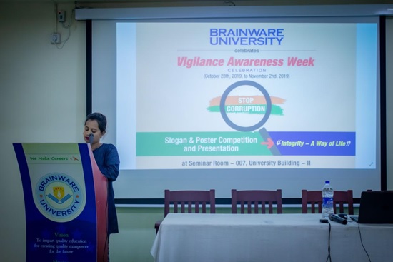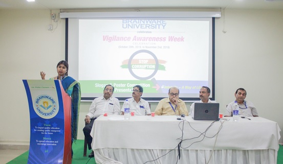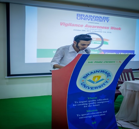 On 28th October 2019, Brainware University took the Integrity Pledge for Citizens, where everyone including senior most officials Vice Chancellor, Pro-Vice Chancellor, Assistant Registrar, the faculty members and students, thereby initiating the weeklong ‘vigilance week’ celebration programme through several activities.
