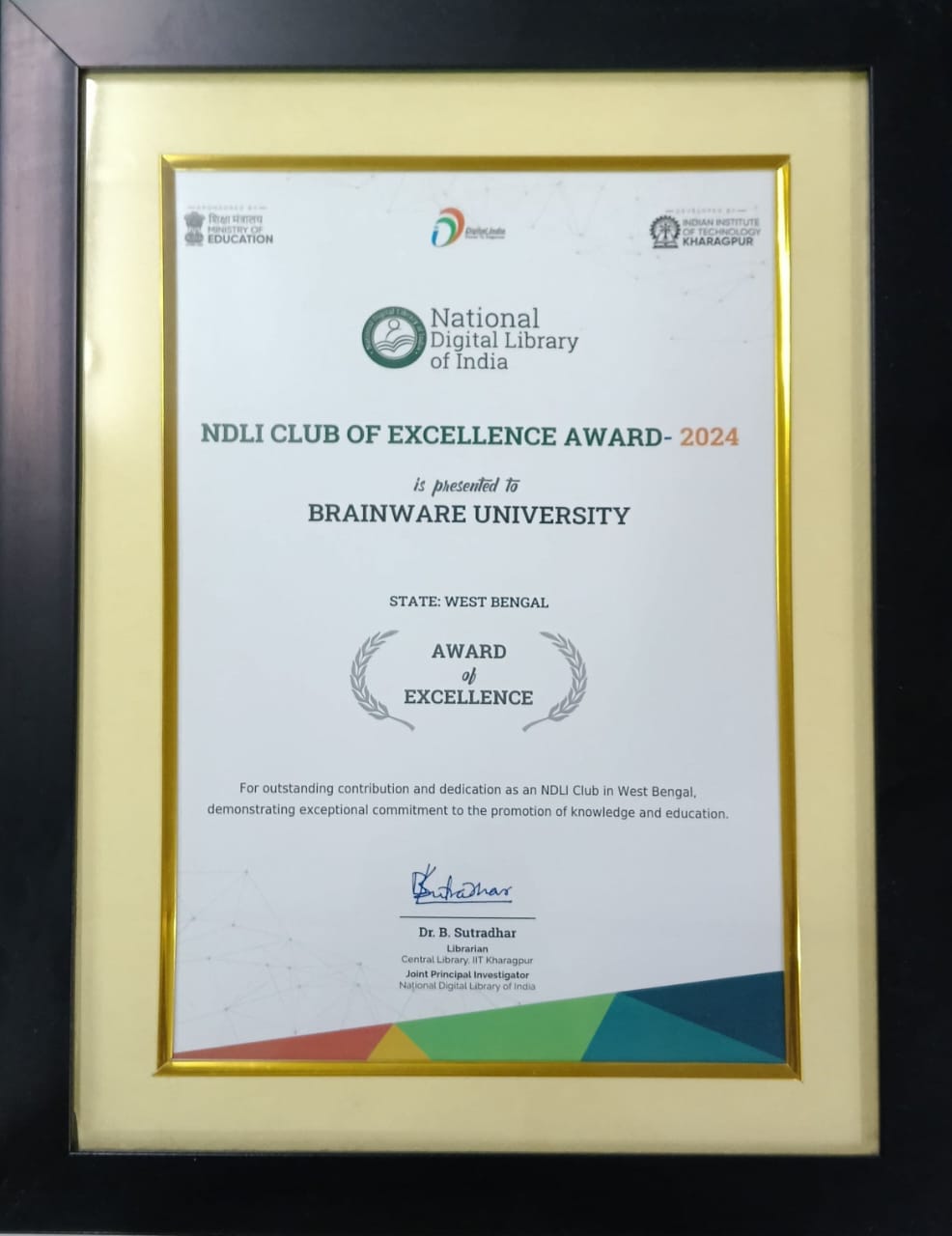 On May 5, 2025, Brainware University was honored with the NDLI Club Excellence Award 2024 by the National Digital Library of India (NDLI), IIT Kharagpur, for being one of the best-performing NDLI Clubs in West Bengal.