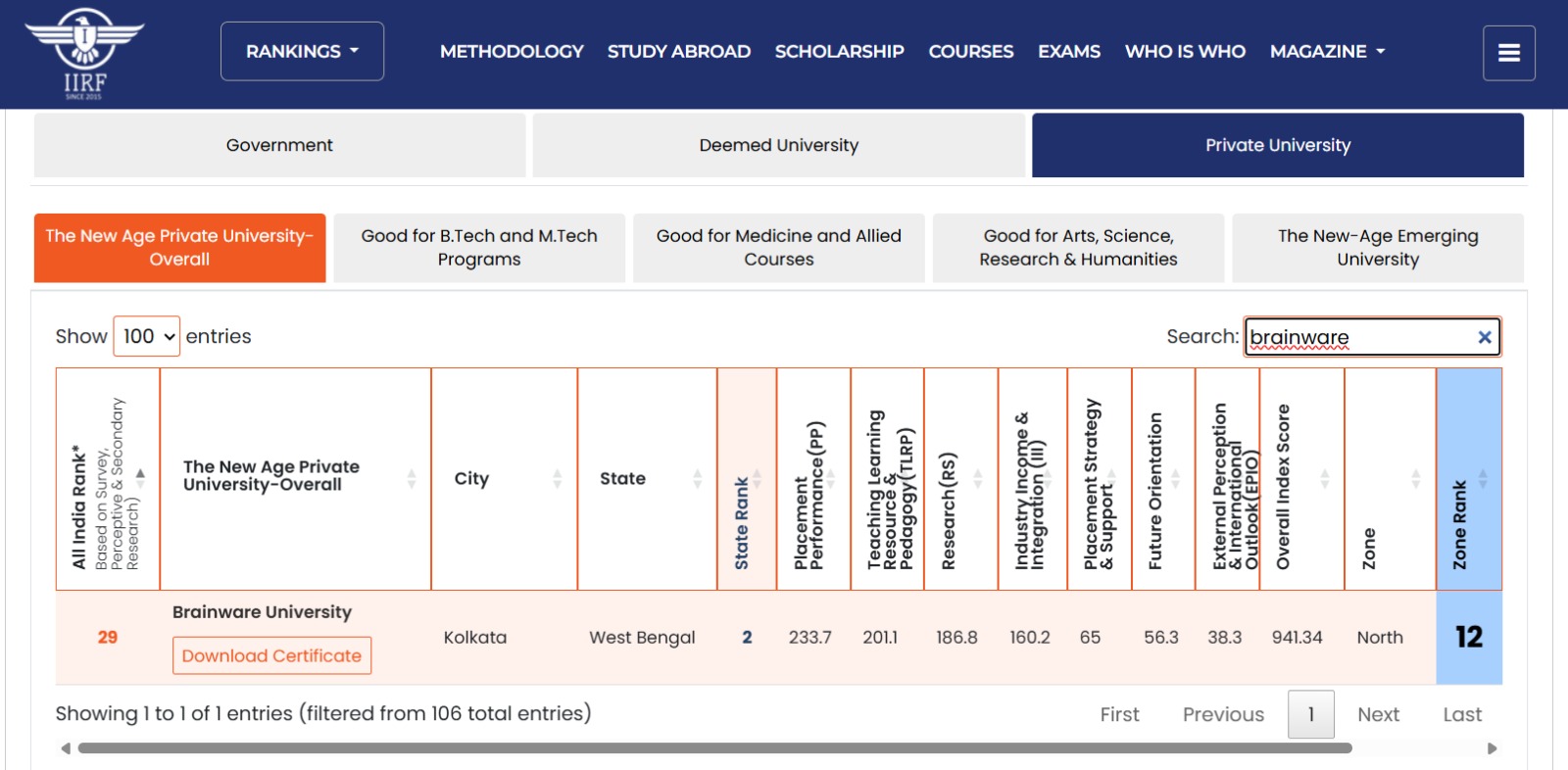 Brainware University has once again secured its position as the No. 1 technical private university in West Bengal, topping the list of private engineering colleges in the state for the third consecutive year. In the 2025 edition of the IIRF rankings, Brainware University received national recognition under the category of 'The New Age Private University' and was lauded for its academic excellence across Arts, Science, Research, and Humanities, as well as for its outstanding BTech and MTech programs.