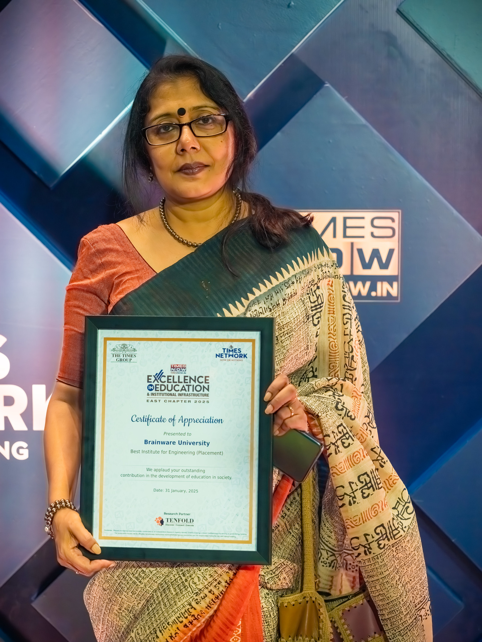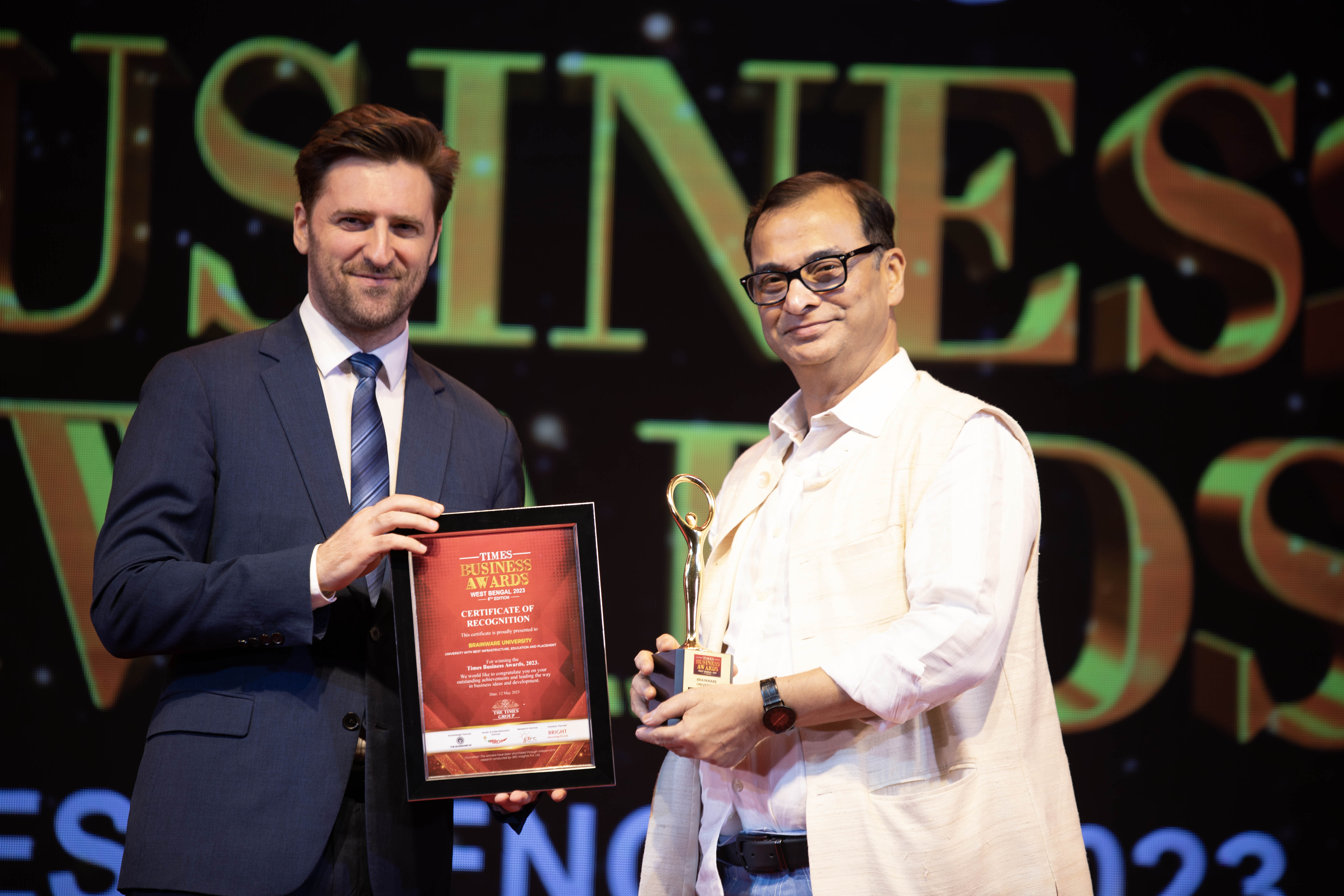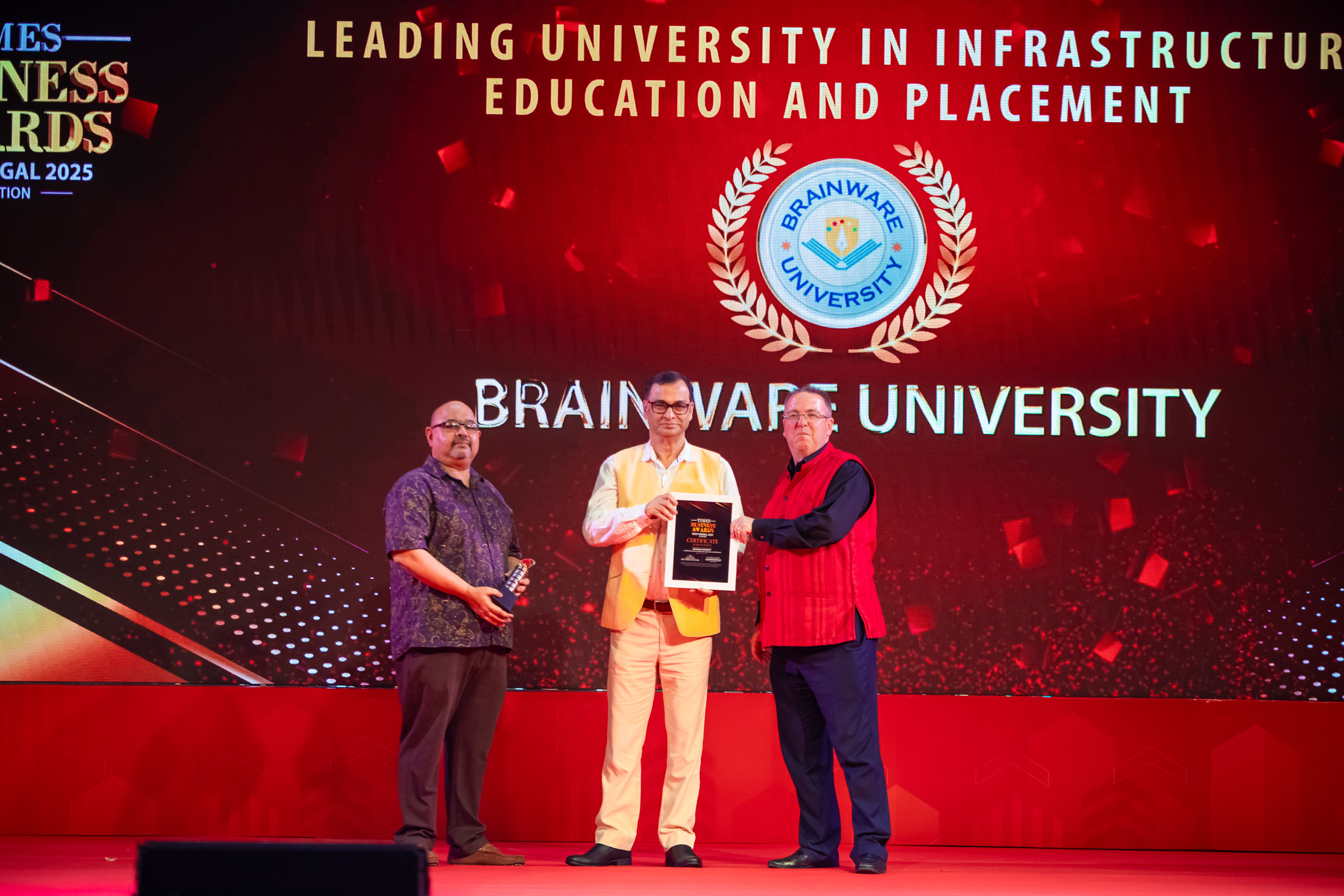 Brainware University has been conferred the Times Business Excellence Award 2025 by Times Now.in, recognised as the Leading University in Infrastructure, Academics & Placement. This marks a continued legacy — having been honoured as the Best University in Infrastructure, Education, and Placement by the Times of India Business Award in 2022, 2023, and 2024.