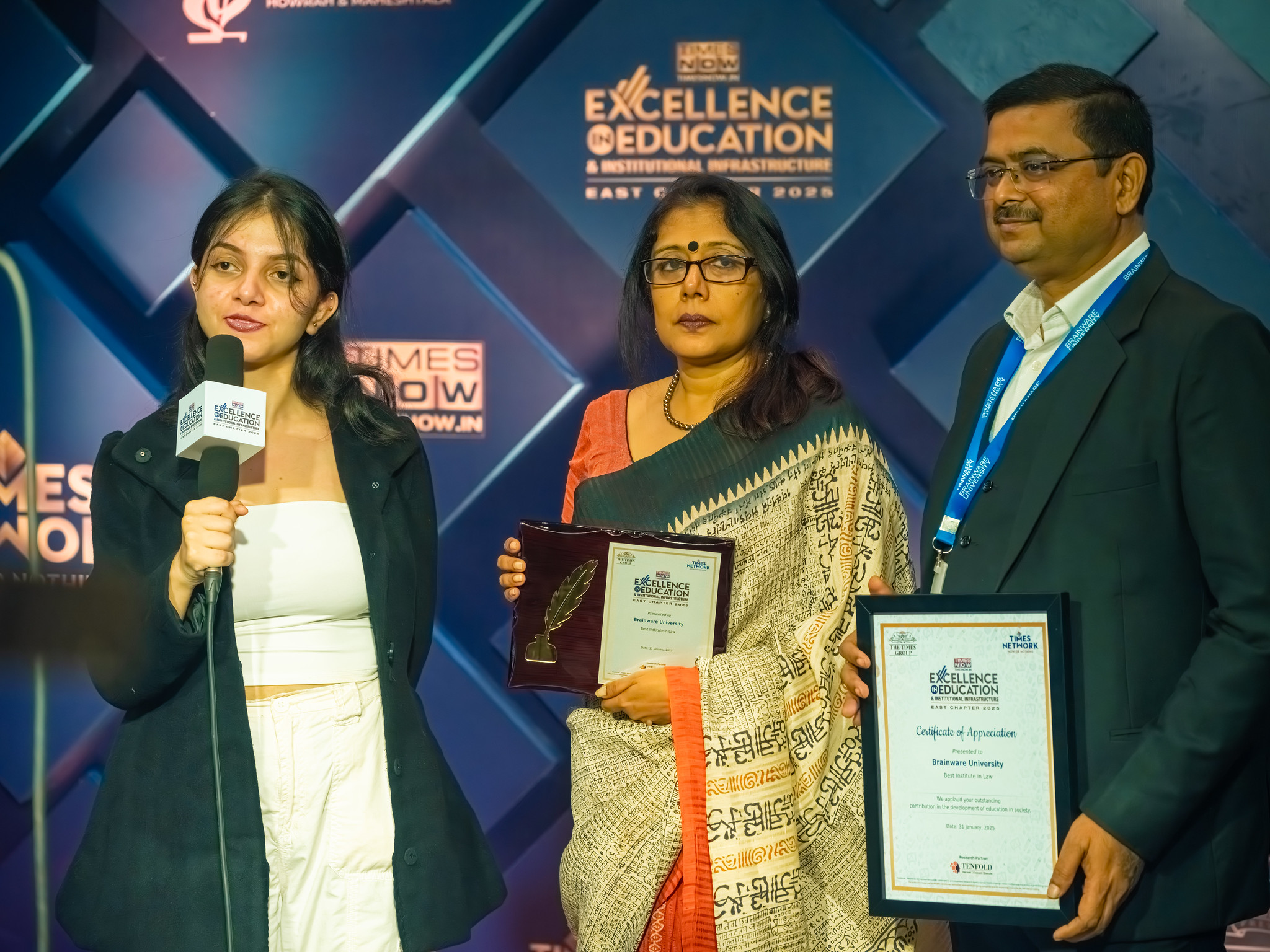 Brainware University is pleased to have received recognition for excellence at the Times Now.in Excellence in Education & Institution Infrastructure Awards - East Chapter 2025, earning awards for Best Institute in Engineering (Placement), Best Institute in MBA Education, and Best Institute in Law.