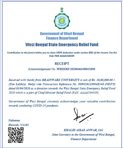 Hope is a powerful force, especially when the time is bleak. Today, the world is facing the coronavirus crisis, a pandemic that has changed life for millions of people. In these trying times, hope is the most compelling source of reassurance. Many who are locked at home, others who are working to help and prevent the virus, also need the reassurance and the hope that we shall overcome this. We, the team members of Brainware, have taken a small step to make this battle easier. We have made a token contribution of ₹10 lac to the West Bengal State Emergency Relief Fund to combat COVID-19 pandemic. Apart from that our individual staff members are also contributing to the Prime Minister National relief fund to their best ability. We have also opened up our hostel building consisting 500 beds to be used as quarantine centre to the SDO of North 24 Paraganas. We sincerely hope that we will win this battle together.