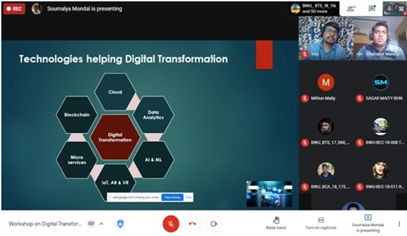 To explain the different facets of the digital transformation journey, a workshop on ‘digital transformation journey’ was organised by the department of Physics of Brainware University on December 15, 2020. The session was graced by the presence of Mr. Soumalya Mondal (Solution Architect, Wipro) as the key speaker.