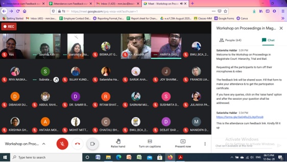 To provide a deep insight into the functioning of the legal systems, a workshop on ‘Proceedings in Magistrate Court: hierarchy, trial and bail’ was organized by the Department of Law, Brainware University on December 12, 2020. The guest speaker, Ms. Paromita Das (LL.B), Assistant Public Prosecutor, Class-1, Gazetted Officer, Govt of West Bengal, was invited to grace the occasion. The session was conducted through Google Meet with more than 80 participants.