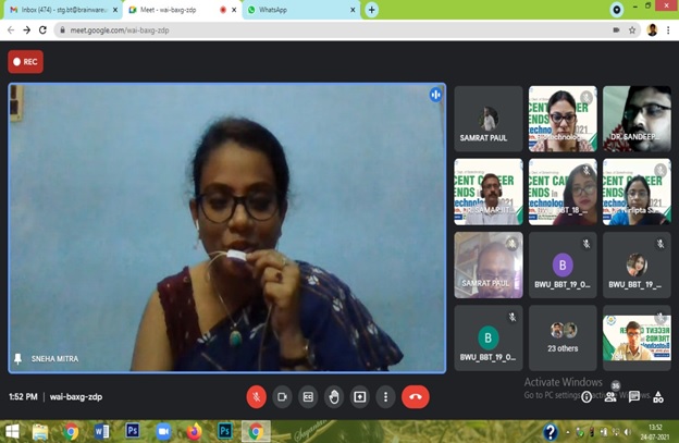 The Department of Biotechnology organised a National Conference on “Recent Career Trends in Biotechnology 2021” on July 24,2021 to give students a clear picture of the current industry trends and job market opportunities. Dr Susmita Roy (Research Officer (Microbiology), CCRAS, Ministry of AYUSH), Dr. Sneha Mitra (Technical Manager, BD Biosciences), Dr. Shibabrata Mukherjee (Senior Staff Scientist, Division of Immunobiology, Cincinnati Children’s Hospital and medical centre) were the guest speakers for the event.