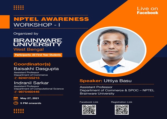 NPTEL Awareness Workshop-I was Brainware University’s effort to encourage its students to look beyond the structured curriculum and use numerous avenues available to gain knowledge and train themselves in the modern advancements in various academic and non-academic fields. On May 19, 2021, Mr. Uttiya Basu, SPOC-NPTEL, graced the workshop as the chief resource person, and spoke about the importance and advantages of the MOOC courses run by the government of India in developing newer skill sets in students all over the country.