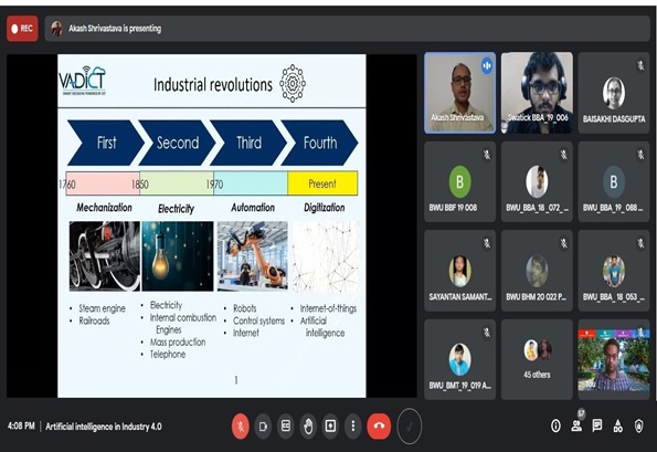 The School of Management & Commerce of Brainware University organized a workshop on ‘Artificial intelligence in Industry 4.0: Role and Various Applications’ on May 29, 2021. In the wake of the 21st century, the importance of technological advancements cannot be denied. It is with this objective of providing a deeper insight into the basic concepts of AI that the workshop was planned. The guest speaker, Dr. Akash Shrivastava, Research Scientist (Reliability and Condition Monitoring), Vadict Innovations Pvt Ltd., was invited to grace the occasion and explain the convergence of Artificial Intelligence and the corporate world. With more than 90 participants, the session was conducted online through Google Meet.