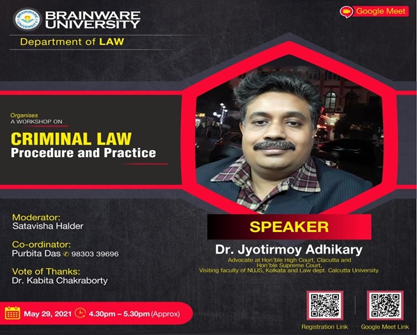 To make the students aware of the criminal offences, penalties and modes of judgement, the Department of Law, Brainware University, organized a workshop titled “Criminal Law: Procedure and Practice on May 29, 2021 from 4:30 PM. Dr. Jyotirmoy Adhikary (Advocate of Hon’ble Supreme Court and Hon’ble High Court of Calcutta) was the guest speaker of this event.