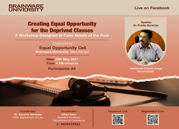 To oversee the effective implementation of policies and programmes for disadvantaged groups as a part of Brainware University’s social commitment and to provide guidance and counseling for academic, financial, social and other matters the Equal Opportunity Cell of Brainware University Organized “Creating Equal Opportunity for the Deprived Classes: A Workshop Designed to Cater Needs of the Poor” on May 29,2021. Dr. Pradip Banerjee (Additional District Judge, Murshidabad) was the guest speaker for the event.