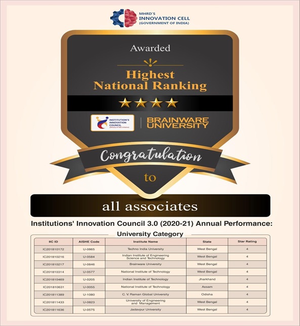 It is with great pleasure that we inform our students, faculties, staff and other stakeholders that Brainware University’s Institutions’ Innovation Council’s annual performance in promoting entrepreneurship amongst students received the highest four star rankings from MHRD, Government of India. It has been the tireless efforts of everyone involved which has allowed us to serve our students and make them self-reliant. At Brainware University we don’t restrict ourselves to conventional job avenues alone but also extend the idea of employment to job generation. We hope in the coming year we will live up to everyone’s expectations and empower our students to chart their own way towards success.