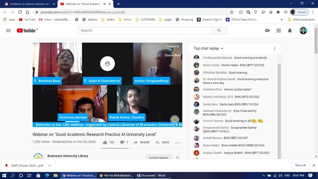 To provide a detailed overview on good research integration, a webinar on ‘Good academic research practice at university level’ was organized by the Library Department of Brainware University on 20 October, 2020. The speaker, Dr. Hiranmoy Mondal (Director Research, Brainware University), began his presentation by enumerating a number of factors needed before beginning the process of research, such as searching, listing, writing or documenting and learning extensively about the topic of interest. Then he gave a framework necessary for content and style of the research proposal. Also, he emphasized how important the role of a good advisor/supervisor is to guide the students about the rules and regulations regarding effective research.