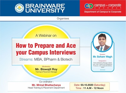 The pandemic has transformed the job market in many ways. To help our students cope with the changing times, the C2C Department, Brainware University, organized a Virtual Leadership Talk —‘How to Prepare and Ace Your Campus Interviews’ on October 3, 2020. Mr. Soham Wagh, Senior Marketing Manager, GlaxoSmithKline, discussed the smart strategies students should implement to bag their desired jobs. Discussing the specific situation, task, action, and result helps prepare and provide clear and concise responses using real-life examples. The webinar ended with a Q&A session where the students received answers to many of their interview-related doubts.