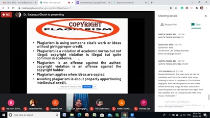 Copyright, for ages, has been an intangible and exclusive right to intellectual property of humankind. It not only encourages the creator’s efforts in literary, artistic, dramatic and musical works, in sound recordingand cinematography, but protects the creator’s rights to reproduce, publish, sell or even rent a piece of original intellect.Keeping this in view, a webinar on “Understanding Copyright Protection Law of India: its Concept and Working”, was organised by the Department of Law of the Brainware University, on 5th October, 2020. The speaker, Dr. Satarupa Ghosh, Assistant Professor at Coochbehar Panchanan Barma University, kept the audience engrossed with her immense knowledge and understanding on the ‘Law’ and its objectives.
