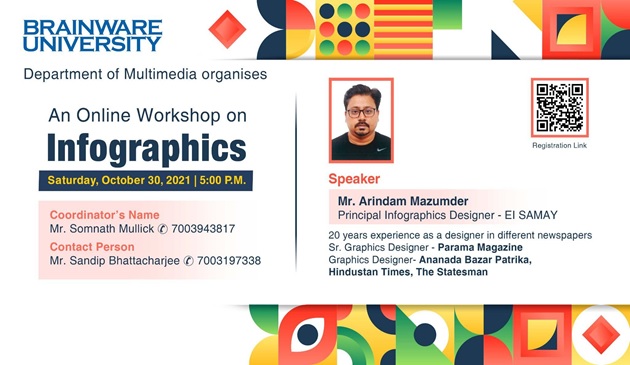 The Department of Multimedia, Brainware University was pleased to organize an Online Workshop on Infographics on 30th October 2021, 5.00 pm. Mr. Arindam Mazumdar led the engaging workshop Drawing on his vast experience of over 20 years working as a senior graphics designer at reputed news outlets like Ananda Bazar Patrika and The Statesman. Mr. Mazumdar explained how in a world that is largely obsessed with visual representation, infographics become a creative way for representing and spreading information. “You will have no shortage of clients, from government agencies to MNCs all depend upon infographics,” he said. He introduced students to expert strategies to create interesting infographics and shared resources and databases where students can practice making them.