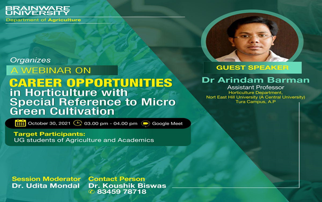 The Department of Agriculture, Brainware University presented students with a wonderful opportunity to learn about the market trends and demands. The Webinar on Career Opportunities in Horticulture with Special Reference to Micro Green Cultivation was organised on October 30, 2021 at 3 PM. Dr. Arindam Barman (Department of Horticulture, North Eastern Hill University) was the special guest for the occasion. Dr. Barman shed light on the niche areas of steady development in the field of horticulture. Opportunities abound, the speaker confirmed in both government and private sector in India for agriculture graduates. “Since India is a leading producer of agricultural products in the world, job opportunities are endless,” he advised. Microgreens, the speaker revealed, was one such area of rapid development thanks to a growing sense of health-consciousness in the general public. Microgreens which overcome the constraints of space while being nutritionally dense is the food for the future. Dr. Barman also shared insiders’ knowledge about job opportunities in his field.