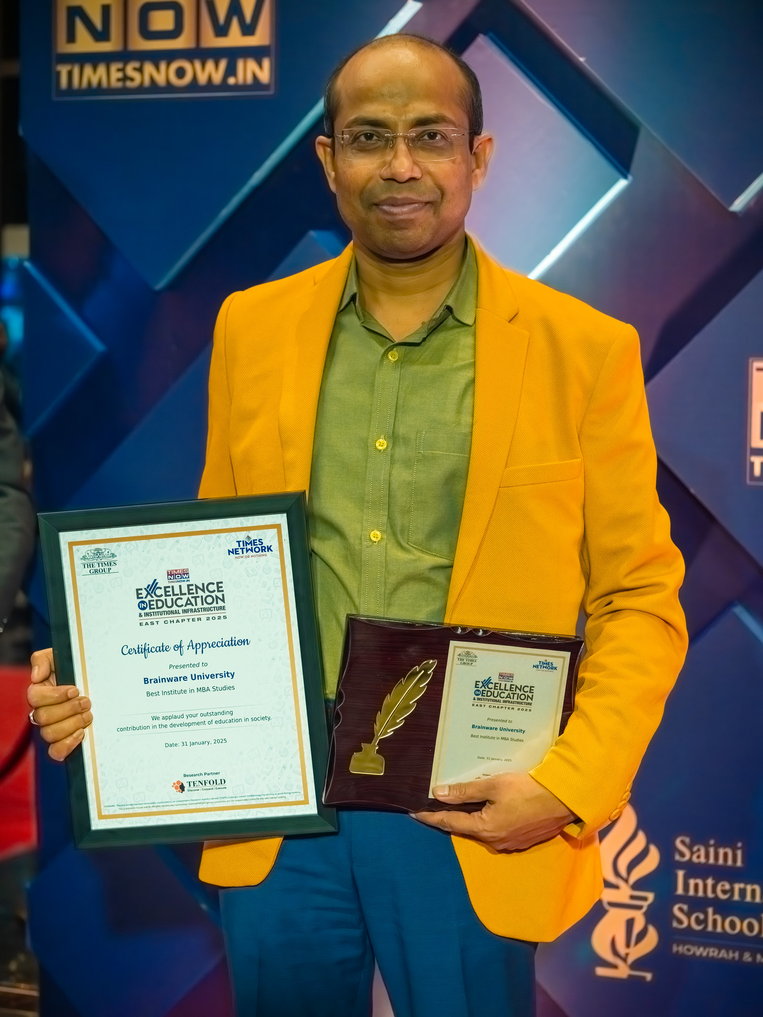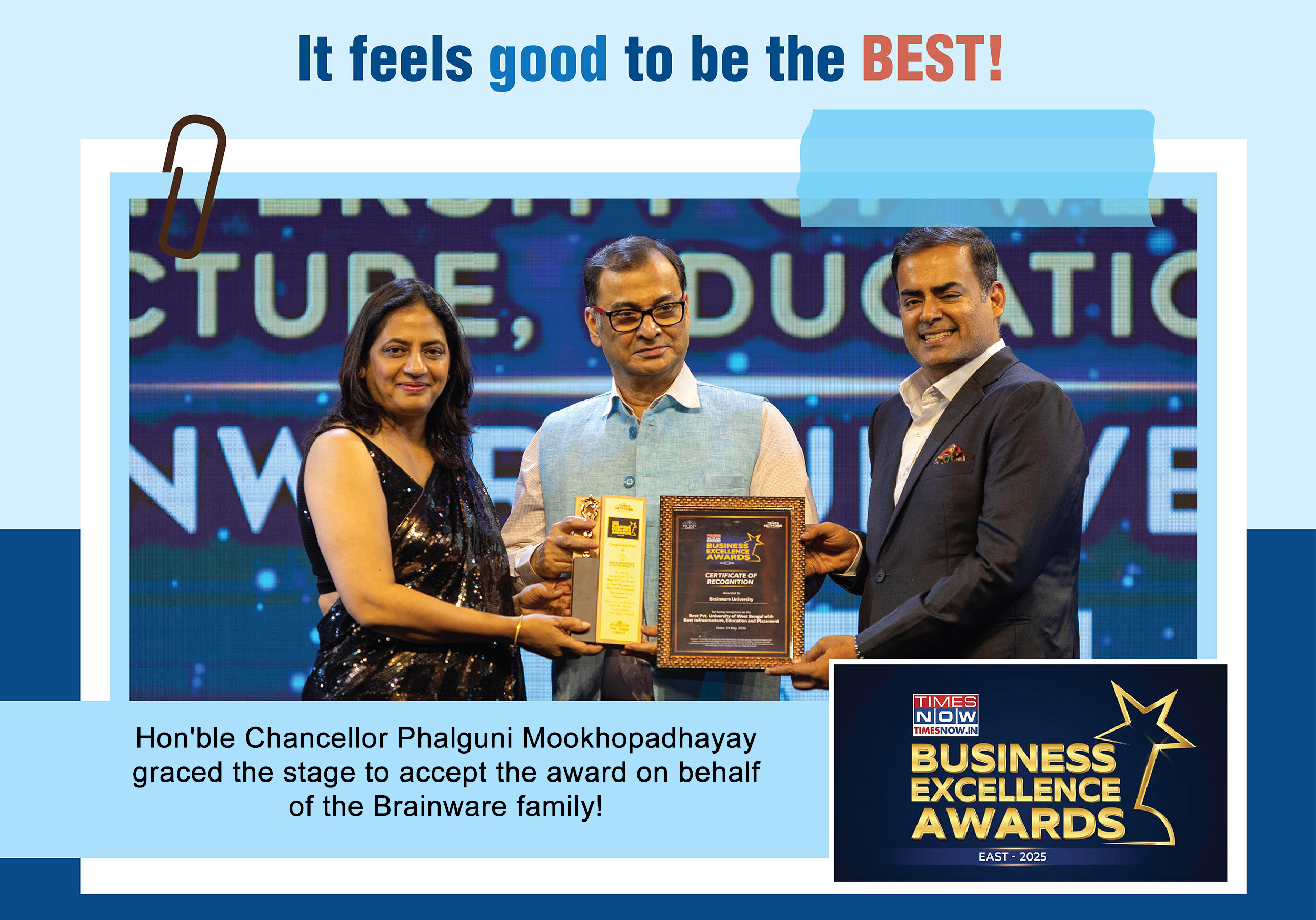 Brainware University has been conferred the Times Business Excellence Award 2025 by Times Now.in, recognised as the Leading University in Infrastructure, Academics & Placement. This marks a continued legacy — having been honoured as the Best University in Infrastructure, Education, and Placement by the Times of India Business Award in 2022, 2023, and 2024.